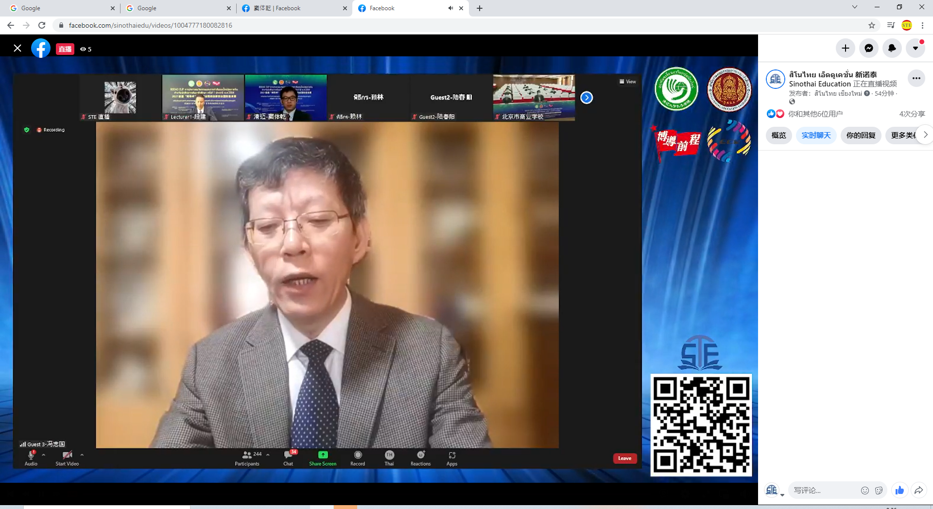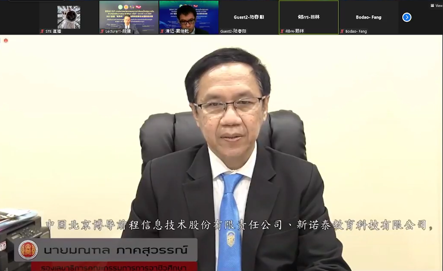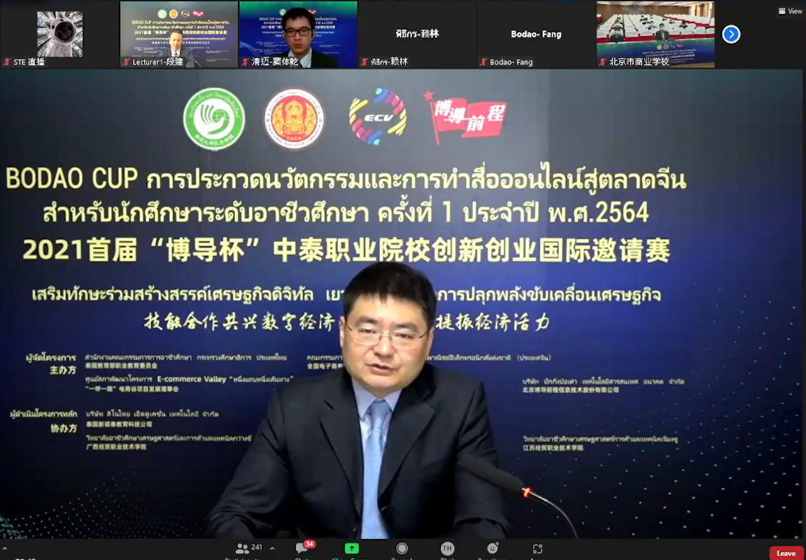 培训由泰国教育部职业教育委员会(以下简称“职教委”)、全国电子商务职业教育教学指导委员会(简称“行指委”)、“一带一路”电商谷项目建设发展理事会、清迈大学孔子学院和北京博导前程信息技术股份有限公司联合主办,新诺泰教育科技有限公司等协办。来自中泰院校师生及企业代表280余人出席线上开班仪式,超过1100人通过B站、Facebook等平台在线观看会议直播。会议由清迈大学孔子学院公派教师赖林主持。
