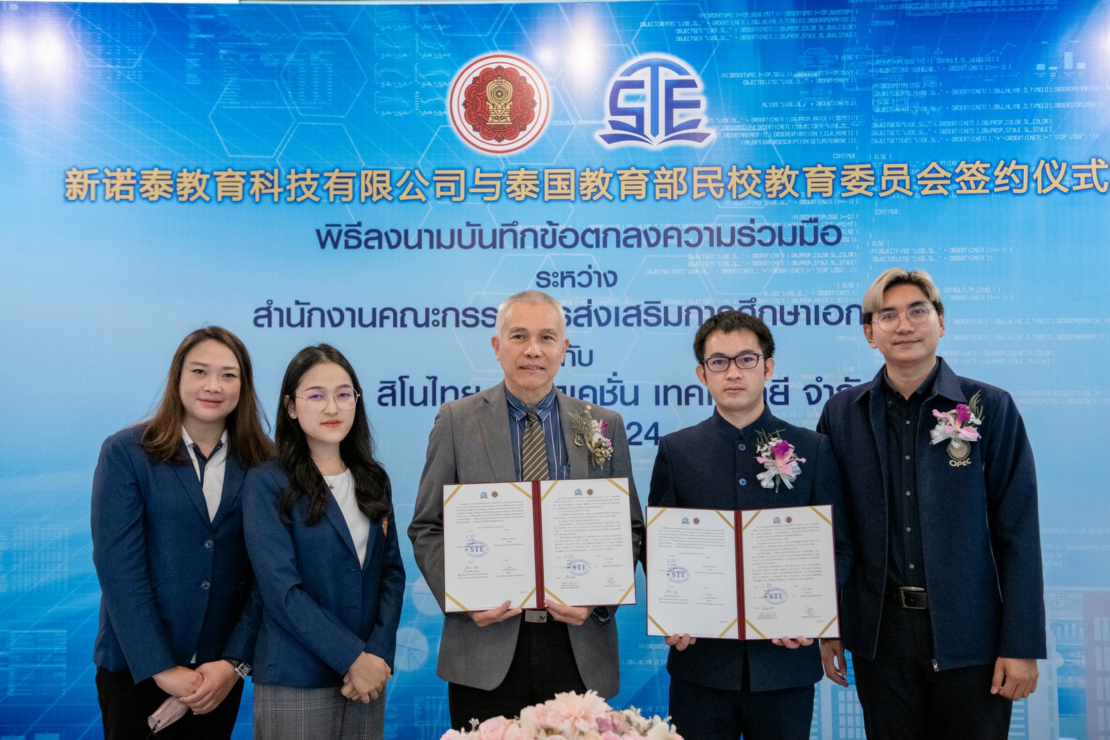 วันที่ 24 ธันวาคม 2565 บริษัท สิโนไทย เอ็ดดูเคชั่น เทคโนโลยีจำกัด นำโดยนายโต้ว ถี่เฉียน ประธานกรรมการผู้จัดการฝ่ายความร่วมมือระหว่างประเทศ บริษัท สิโนไทย เอ็ดดูเคชั่น เทคโนโลยี จำกัด ได้ร่วมลงนามความมือกับ นายมณฑล ภาคสุวรรณ์ เลขาธิการ สำนักงานคณะกรรมการส่งเสริมการศึกษาเอกชน กระทรวงศึกษาธิการ โดยมีนายณรงค์ศักดิ์ บุณยมาลิก ผู้เชี่ยวชาญเฉพาะด้านส่งเสริมมาตรฐานการศึกษา สช. และนางสาวดลฤทัย แซ่ย่าง ผู้จัดการ บจก.สิโนไทย เอ็ดดูคชั่นฯ ร่วมเป็นสักขีพยานในพิธีลงนาม