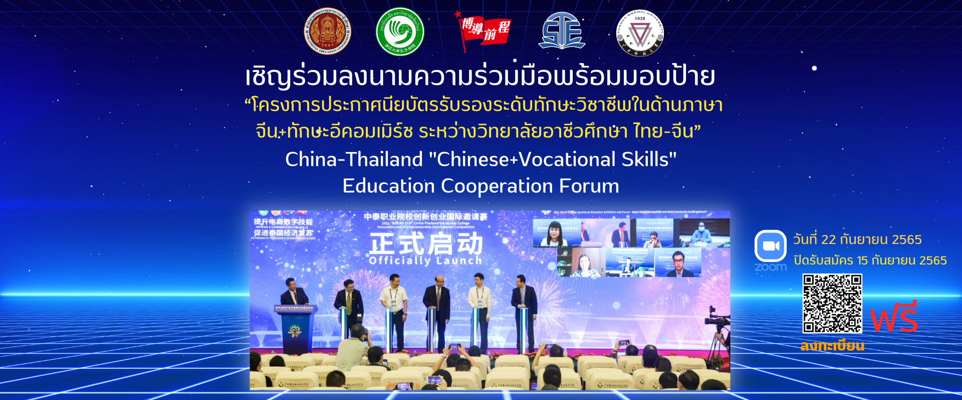 ขณะนี้สมัครเข้าร่วมการประชุมความร่วมมือทางวิชาการ "ภาษาจีน+ทักษะทางวิชาชีพ"ระหว่างไทย-จีนและลงนามความร่วมมือพร้อมมอบป้ายฯ ระหว่างวิทยาลัยอาชีวศึกษาไทย-จีน วันที่ 22 กันยายน 2565 ได้ปิดรับสมัครแล้ว