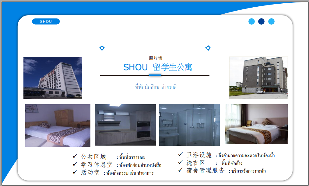Shanghai Ocean University 上海海洋大学 ตั้งอยู่ในเมืองใหม่ Lingang เขต Pudong New Area Shanghai เป็นมหาวิทยาลัยวิจัยประยุกต์สหสาขาวิชาชีพ ในเดือนมีนาคม พ.ศ. 2551 ได้รับการอนุมัติจากกระทรวงศึกษาธิการ Shanghai Fisheries University เปลี่ยนชื่อเป็น Shanghai Ocean University ปัจจุบันเป็นมหาวิทยาลัยที่จัดตั้งขึ้นร่วมกัน โดยรัฐบาล Shanghai Municipal People’s Government, State Oceanic Administration กระทรวงกษตรและกิจการชนบท ในเดือนกันยายน 2560 ได้รับเลือกให้เป็น “มหาวิทยาลัยการก่อสร้างทางวินัยระดับโลก” ของประเทศ